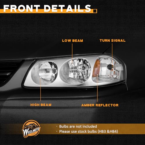 Details: WEELMOTO For 2000-2005 Chevy Impala Headlights Assembly, 2000 2001 2002 2003 2004 2005 00-05 Chevy Impala Headlight Assembly Headlamp Replacement with Chrome Housing Amber Reflector Left+Right Pair